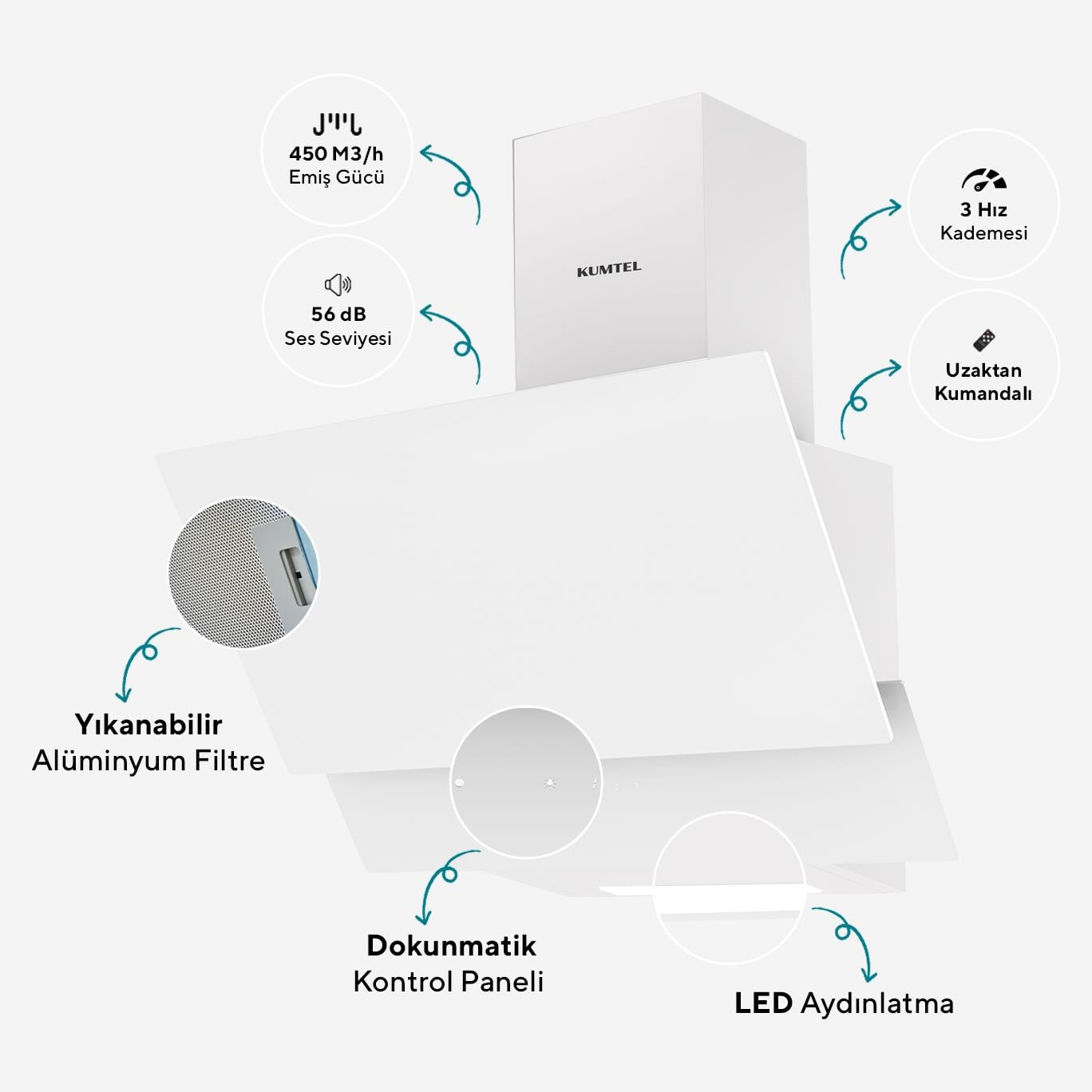 Kumtel Beyaz Dokunmatik Cam Davlumbaz (DA6-835) 450 m³/h emiş gücü 140W motor gücü 3 hız kademesi Ayarlanabilir LED aydınlatma Yıkanabilir alüminyum filtre 56 dB sessiz çalışma Uzaktan kumandalı, dokunmatik kontrol paneli